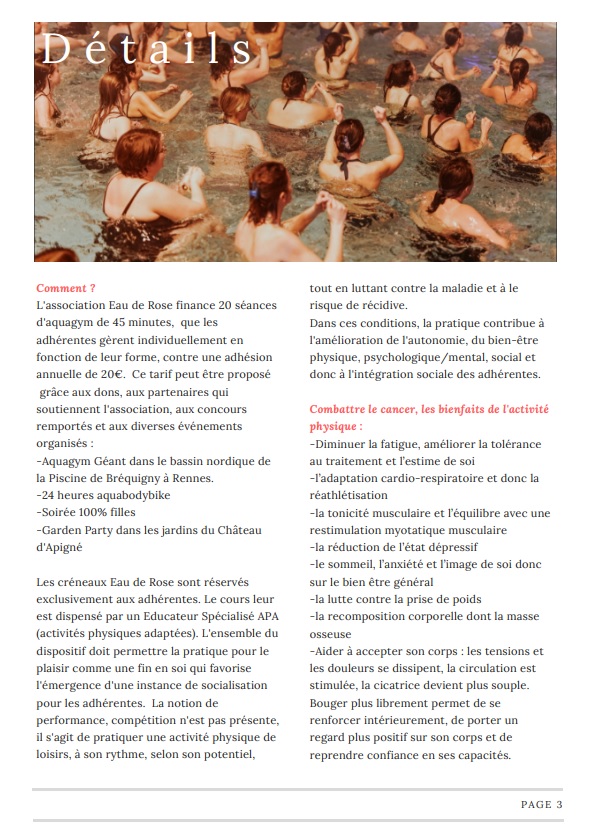 Je suis en stage au sein de l’association rennaise Eau de Rose. Elle existe depuis 2017 et propose à des femmes atteintes d’un cancer féminin de pratiquer une activité lors de cours collectifs d’aquagym et d’aquabike adaptés.