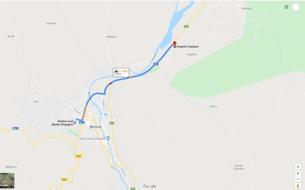 A l’hiver 1993, Mostar voit les deux armées s’opposer, détruire le pont emblématique de la ville,faire près de 2000 morts et provoquer la fuite de 26 000 personnes. La ville est déchiré entre deux camps. Et pour ramener un peu de baume au coeur, il ne faut pas compter pas sur le football, le HSK Zrinjski est ressuscité et récupère le stade de la ville. C’est le débat autour du “vol” du stade par le Zrinjski au Vélez qui marque un point de non-retour. Depuis, le Vélez est contraint à l’exil et sa nouvelle demeure, le Stade Rodjeni, qui se situe à plus de 6 km du centre de Mostar et du Bijeli Brijeg Stadium propriété de la ville et arène du Zrinjski.